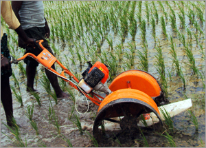 BHEEM paddy weeder is powered by reliable REN 1.75HP 2storke petrol Engine. It is a compact, low weight, easy to operate machine, with a durable floating system. There are six blades on either side for maximum weeding efficiency which weeds two rows at the same time. BHEEM weeder is used for weeding in paddy with the crop distance of 120mm, 150 mm and 180mmwere were paddy is transplanted in row planting method. Apart from removing the weeds, the weeder provides the best aeration to the roots of the plants for better growth and yield.